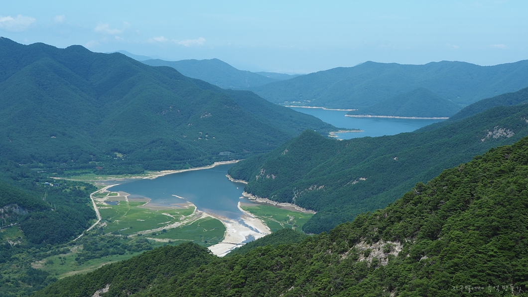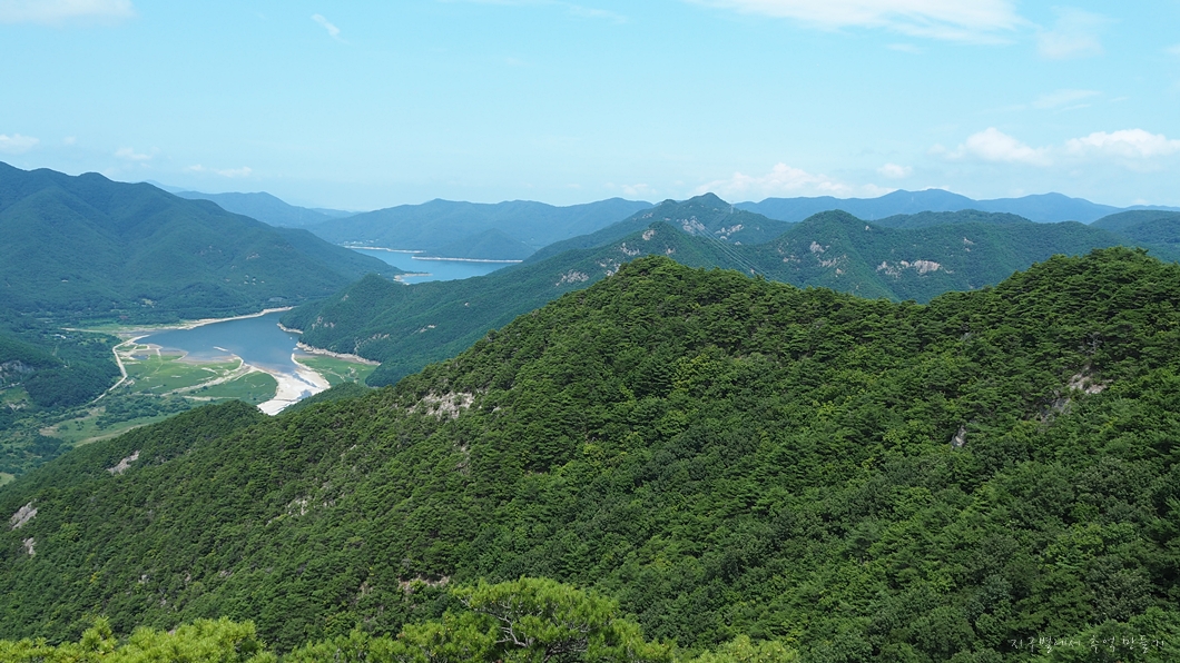 운문호가 내려다 보이고 그 뒤로 멀리 대구 수성구가 조망이 되는데 사진으로는 희미합니다.