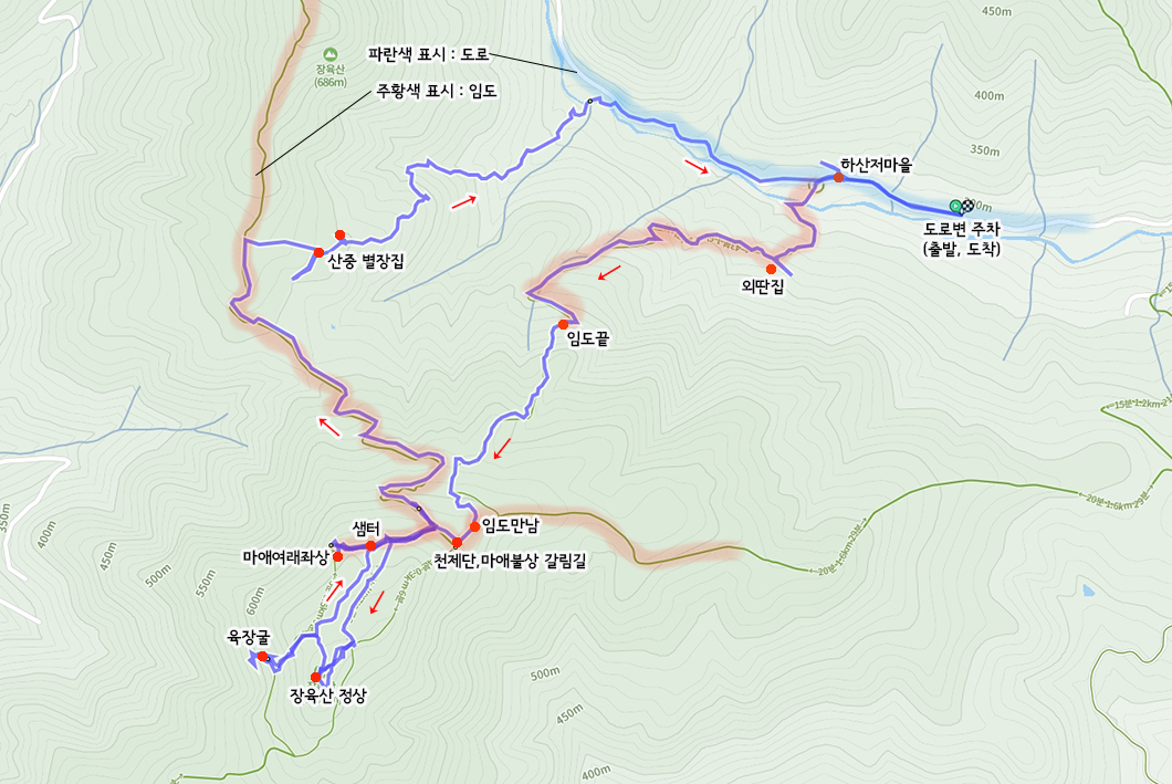 주황색은 임도 구간이고 청색은 도로구간.