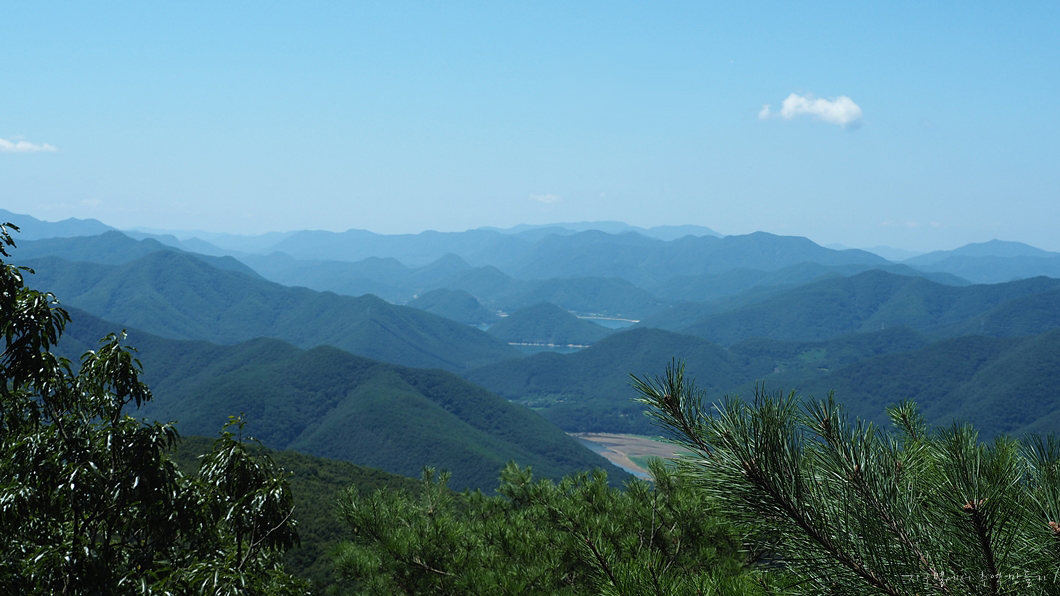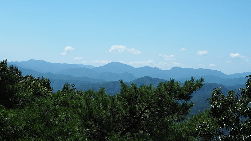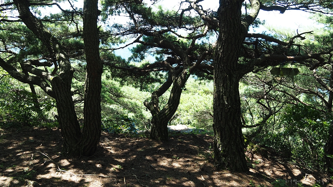 정상에서는 조망이 트이지 않지만 조금 내려오면 소나무들이 멋진 쉼터를 만드는 곳이 있는데 그곳에서 조망이 트입니다.