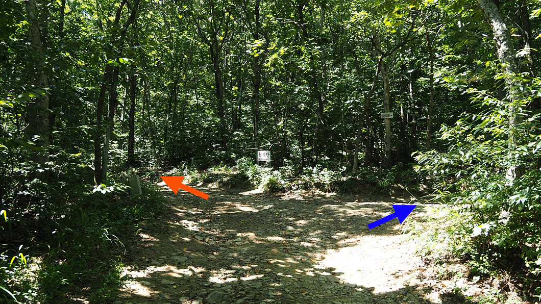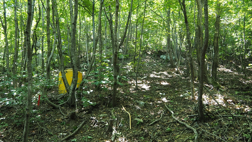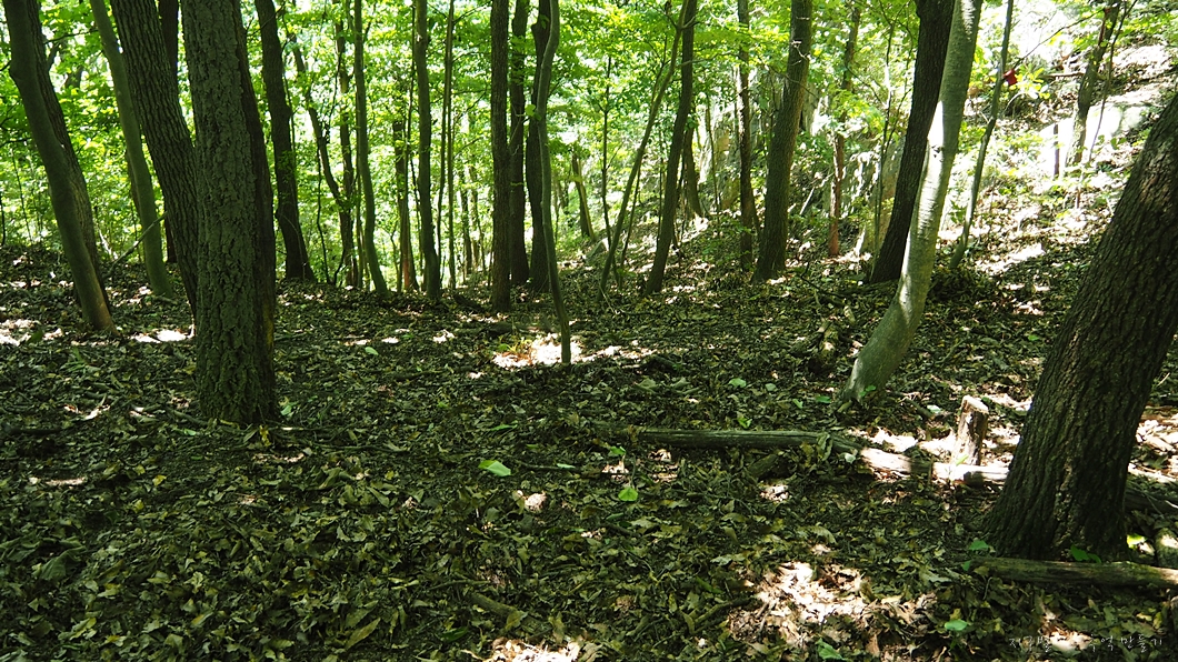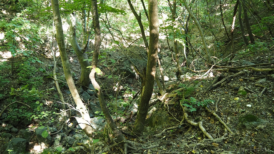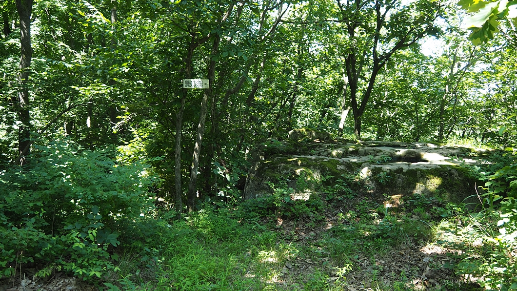 정상에서 북쪽방향으로 내려선 다음 평이한 숲길을 지나 좌측의 급 내려 막길을 100여 m 내려가야 합니다.