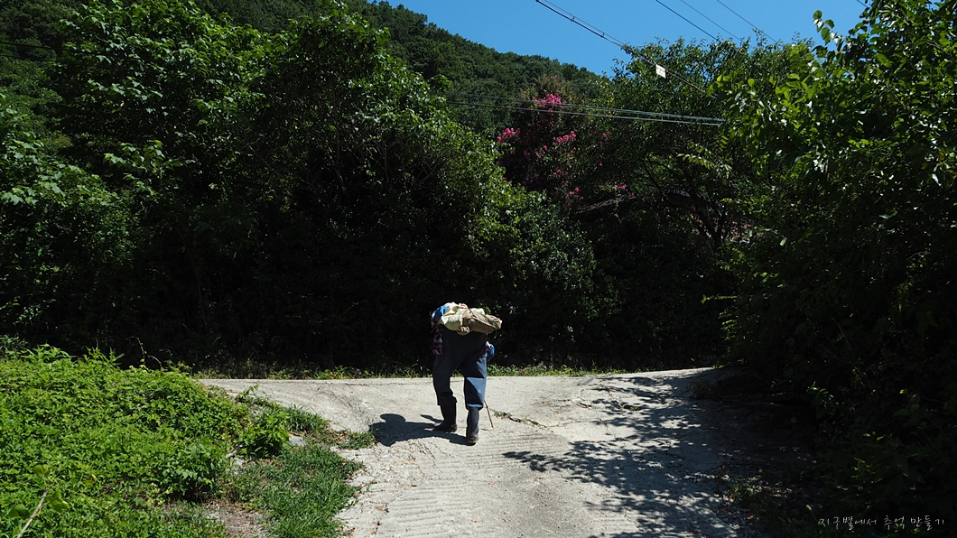 개울로 내려가는데 할무니 한분이 굽은 허리로 뭔가를 지고 올라오십니다.