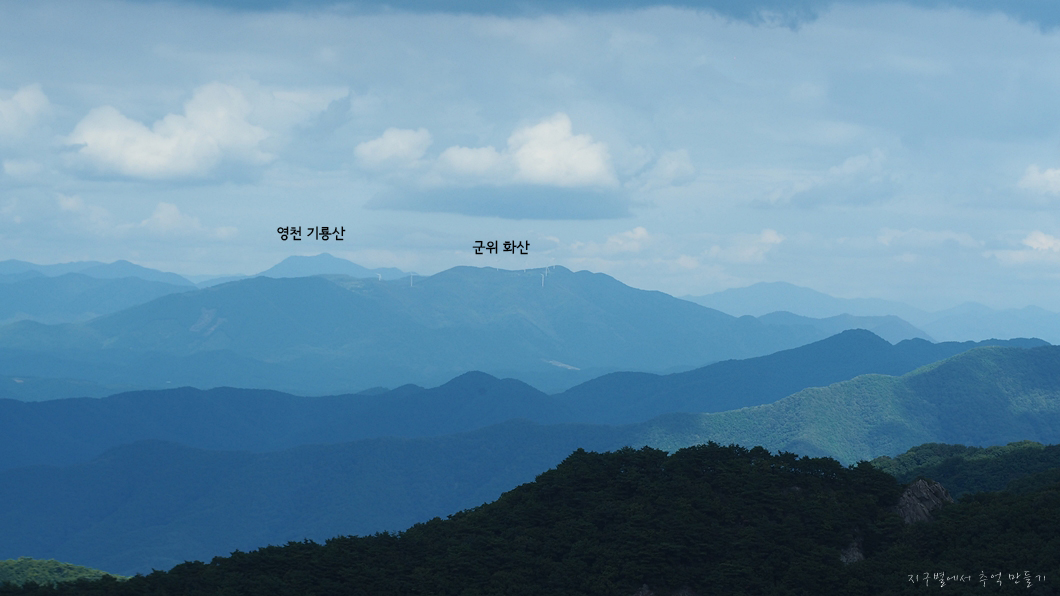 북으로는 군위 화산마을, 화산산성이 있는 화산이 조망되고 그 뒤로 영천의 산들이 보입니다.