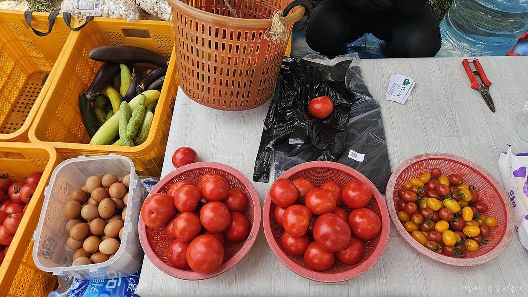 나무 그늘 아래에서는 로컬 토마토를 파는데 김여사와 둘이 구경하다가 하나씩 얻어먹는 바람에 한 바구니 구입했습니다.