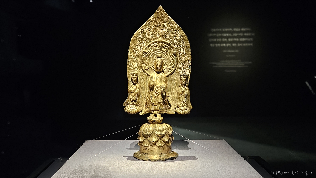 6세기 삼국시대 작품으로 알려져 있고 이름은 계미명금동삼존불입상입니다.