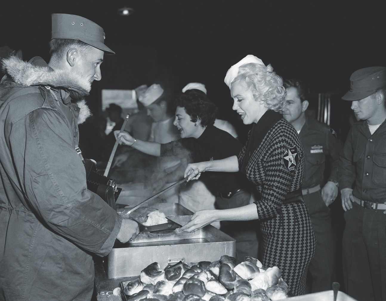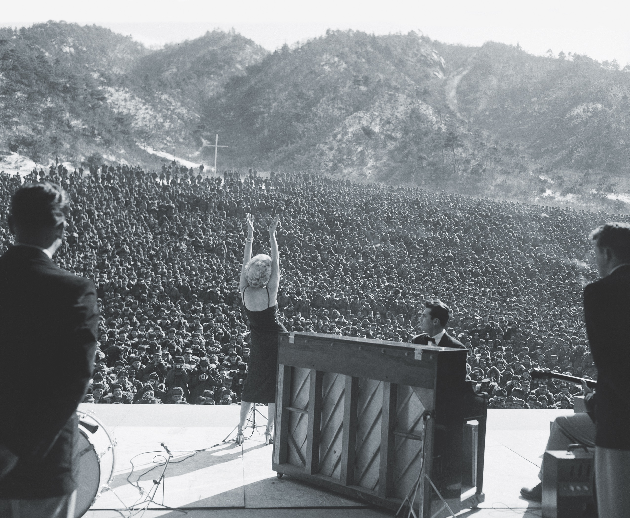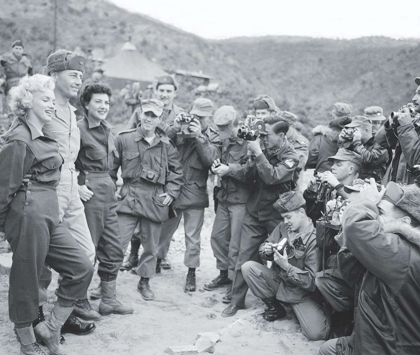 군인들만 바글바글곳에 일본에서 출발한 C-46 코만도 수송기를 타고 한 여성이 내렸는데 신혼여행 중에 일정을 바꿔서 날아온 마릴린 먼로(Marilyn Monroe)였습니다.
