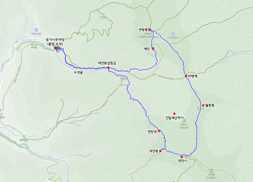 산행 코스 : 유가사주차장 - 수성골 - 정상 - 마령재 - 대견사 - 대견봉 - 유가사(원점회귀)