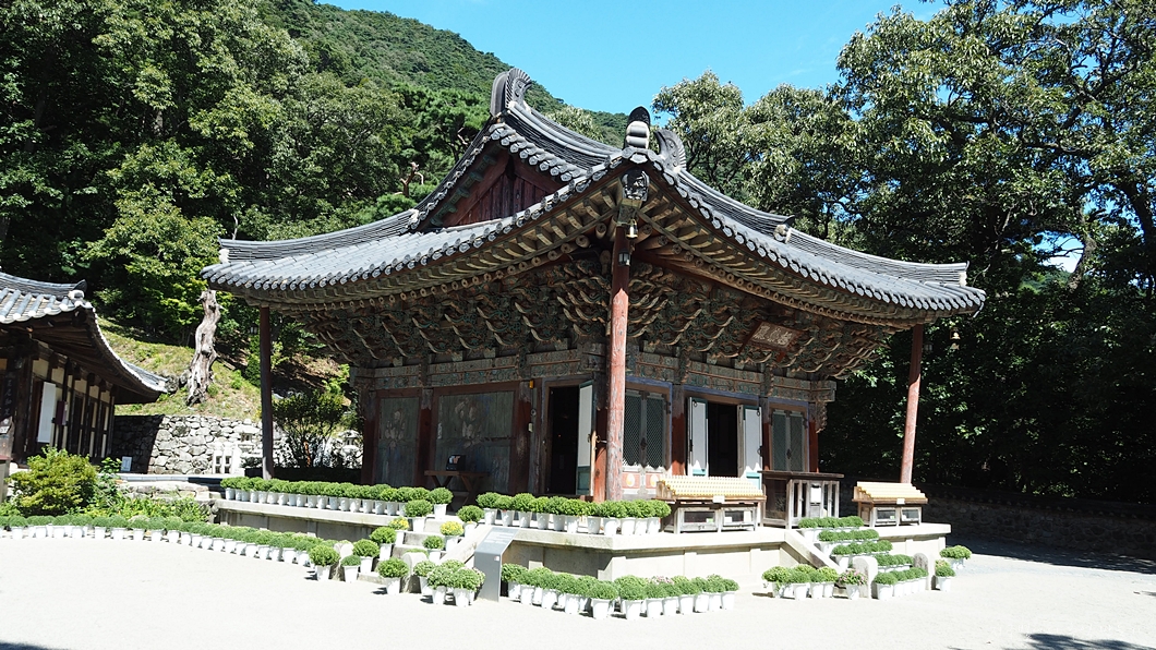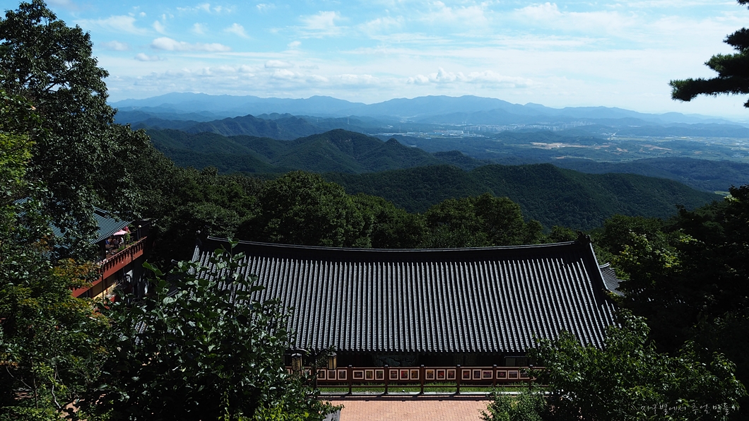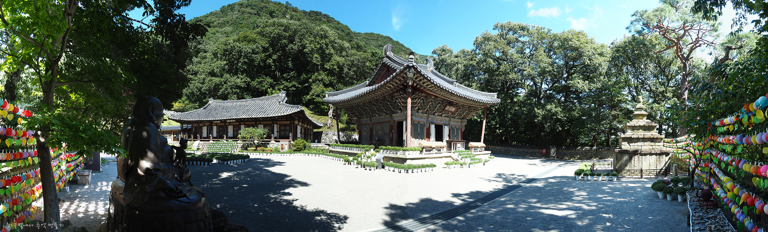 가장 멋들어진 전각인 태조선원과 가운데 극락전, 그리고 우측의 석탑을 같이 보이게 한 파노라마 풍경