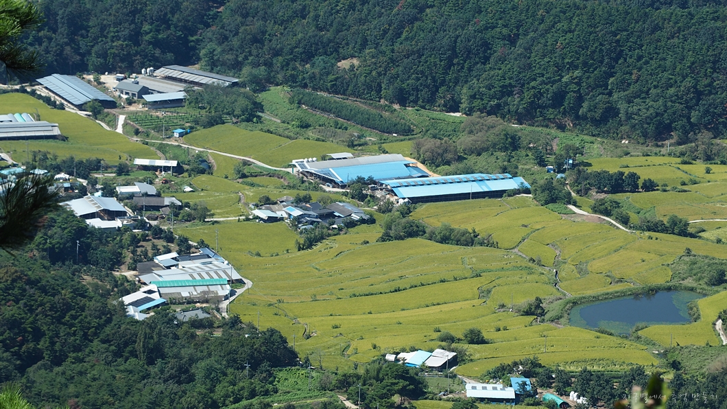 아래로는 수확기를 앞둔 황금색 벼 논이 내려다보이고요.