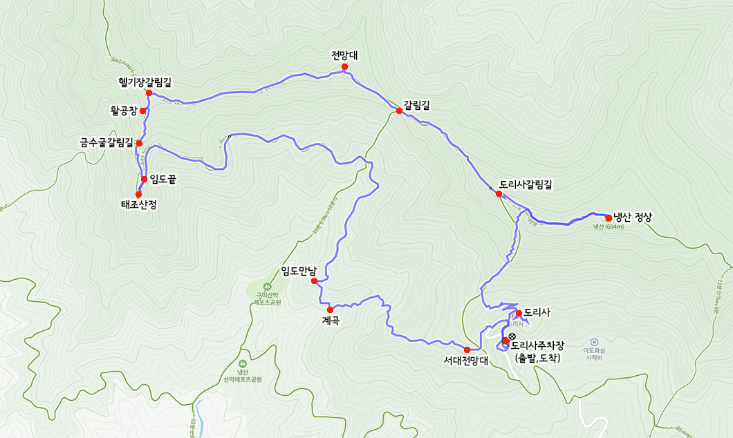 저는 도리사 주차장에 주차를 하고 레포츠공원 쪽으로 주욱 내려갔다가 다시 태조산정 쪽으로 올라서 시계방향 한 바퀴 돌아 내려오는 원점 산행을 했네요.