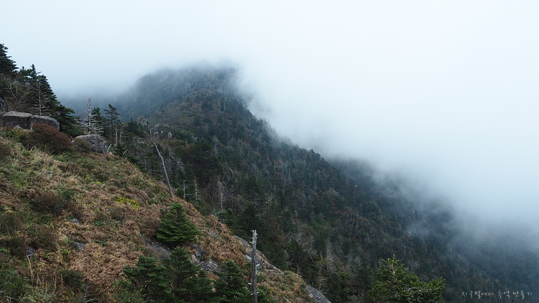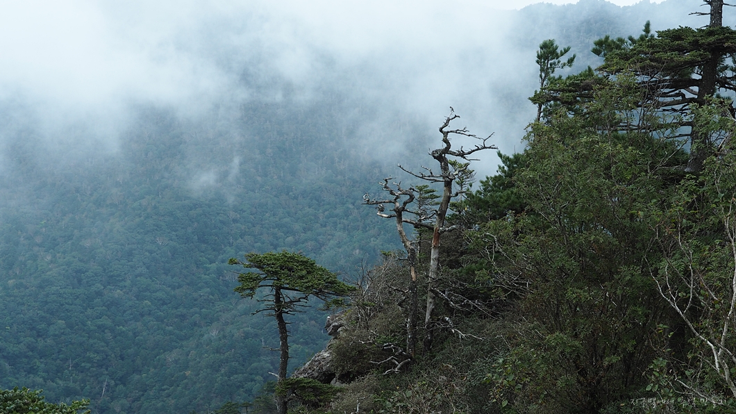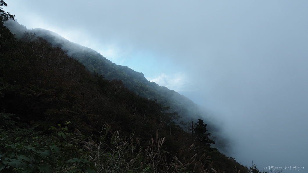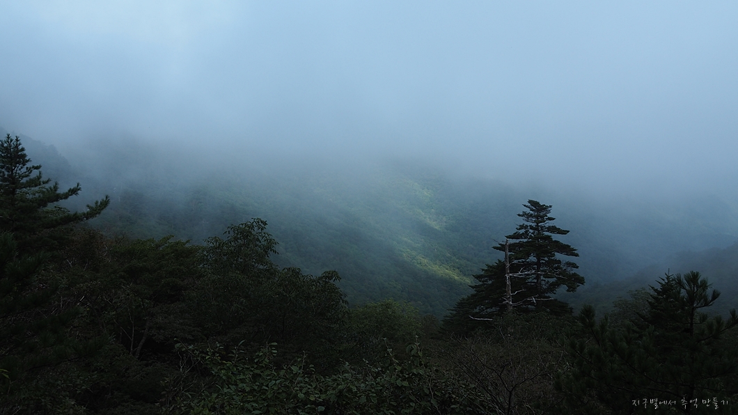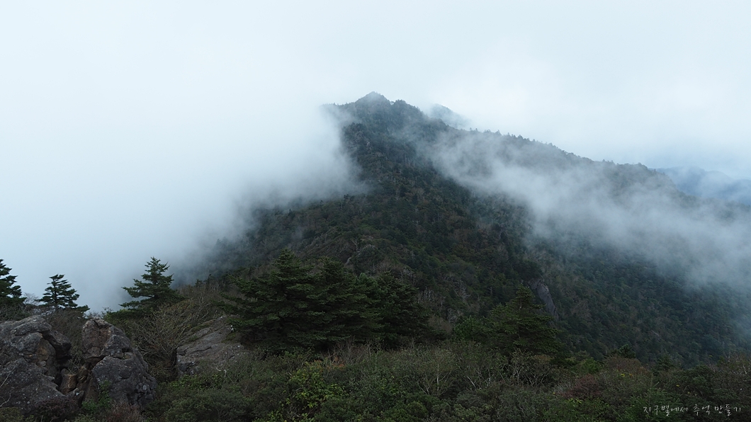 보이는 봉우리 뒤로 멀리 천왕봉이 우뚝해야 하는데 그나마 운무 걷히는 순간이 이 정도밖에 보이지 않네요.