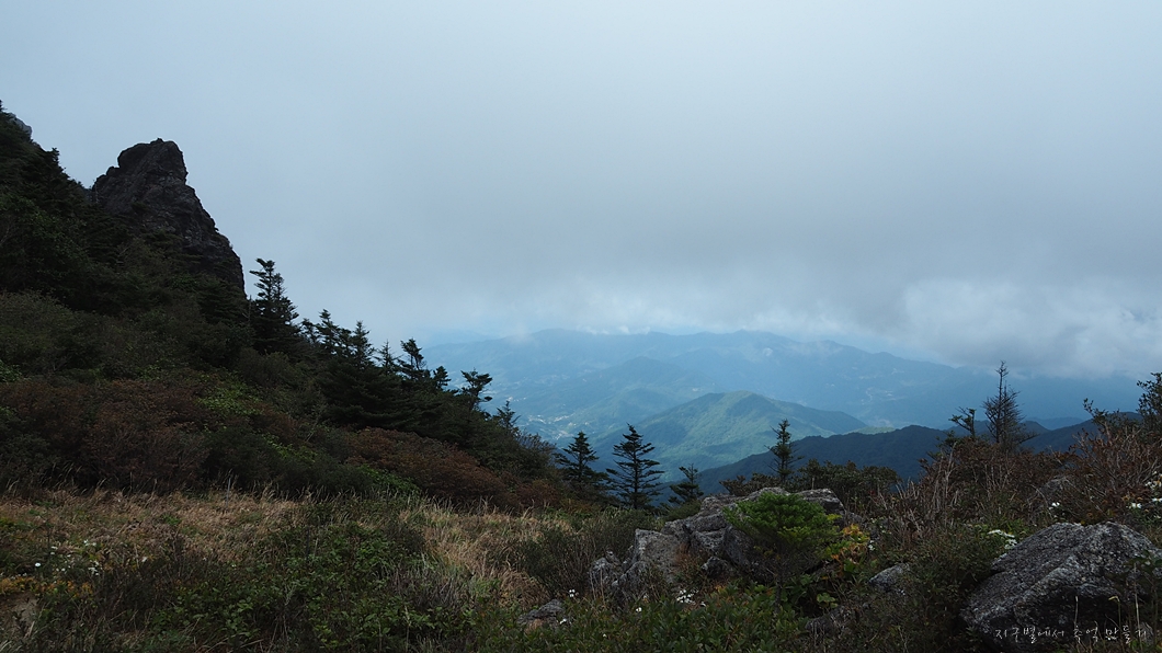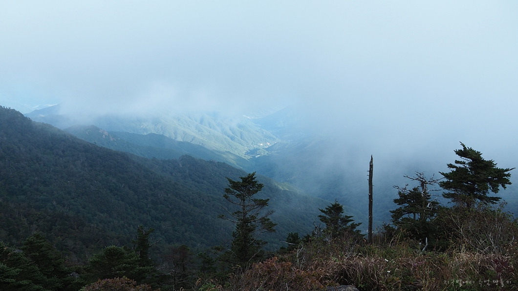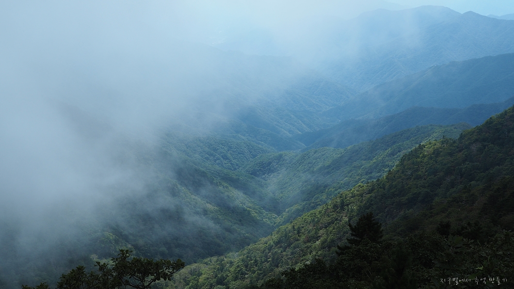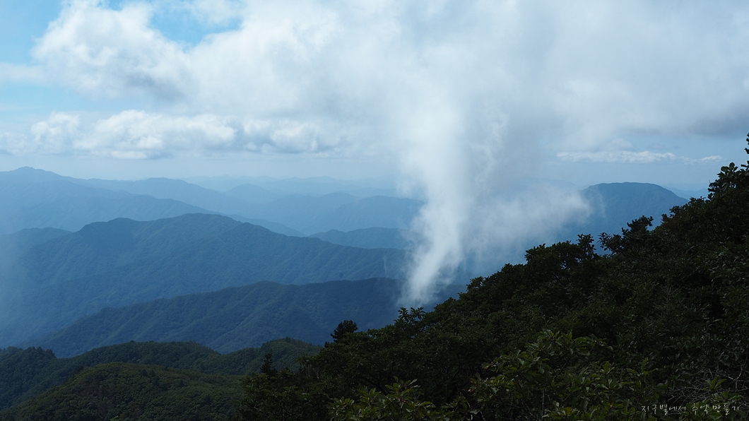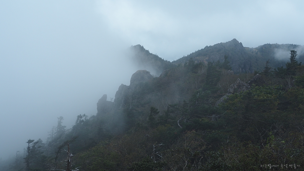 보이는 봉우리 뒤로 멀리 천왕봉이 우뚝해야 하는데 그나마 운무 걷히는 순간이 이 정도밖에 보이지 않네요.