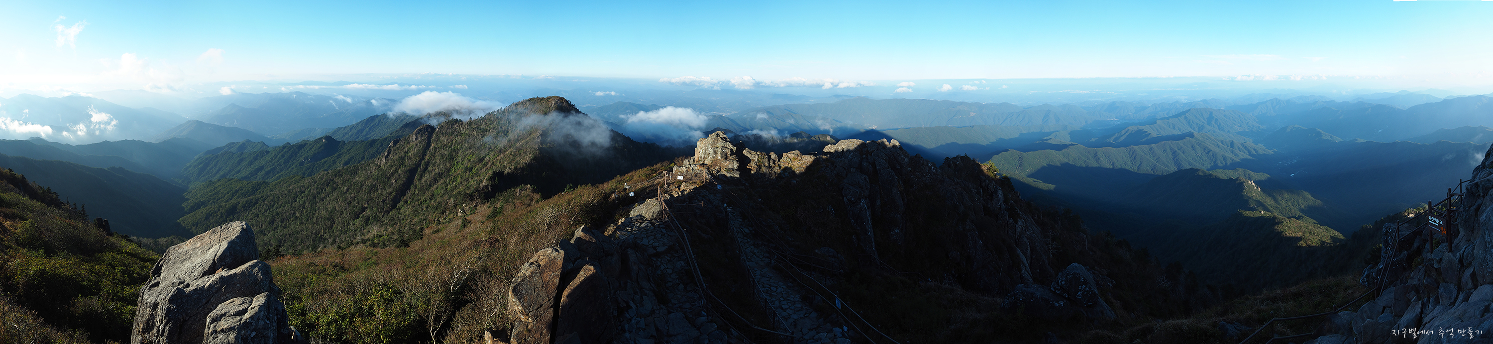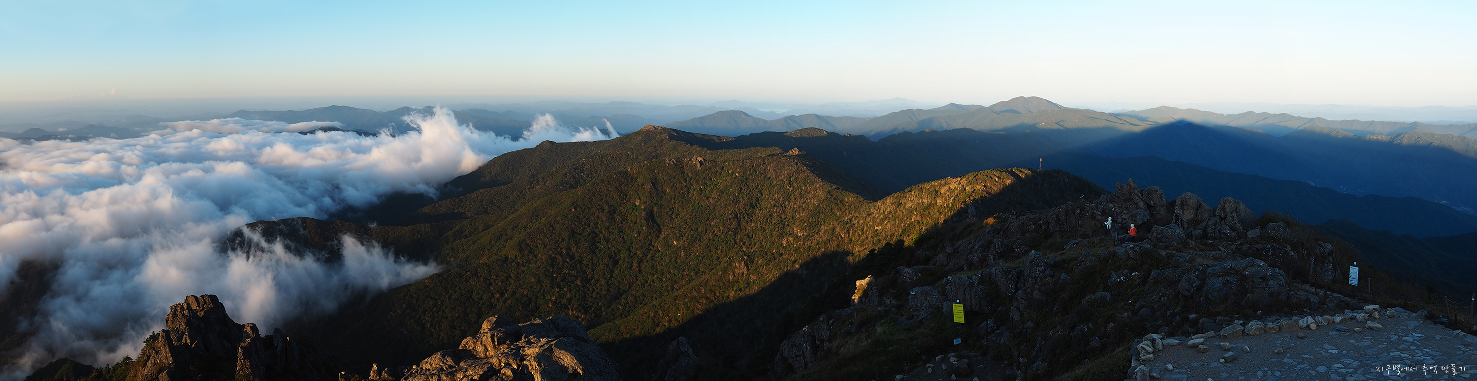 운무가 가려진 남쪽과 지리산 주 능선의 파노라마.
