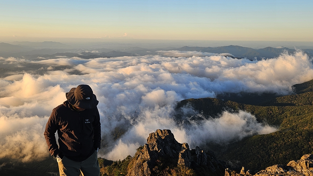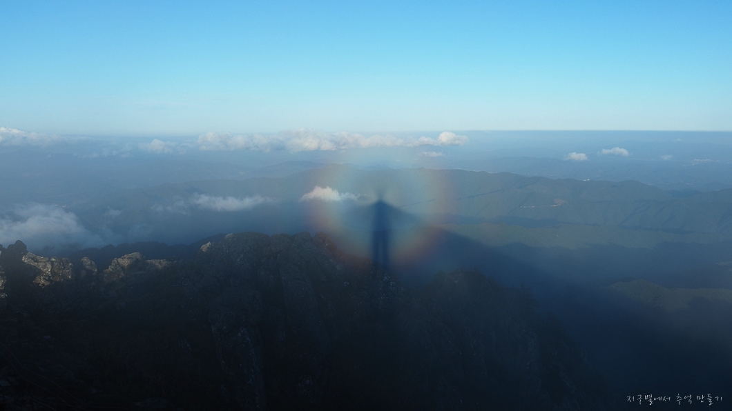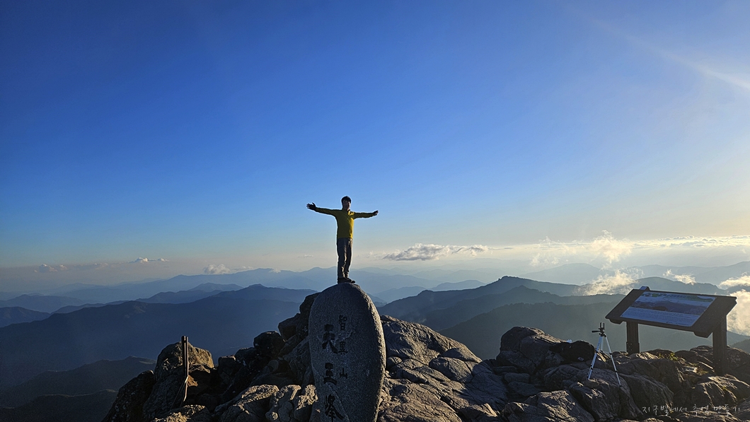 하루 종일 조망 갇힌 운무 속에서 걷다가 천왕봉에 올라오니 갑자기 온 세상이 보이고 시야가 탁 트이는 게..