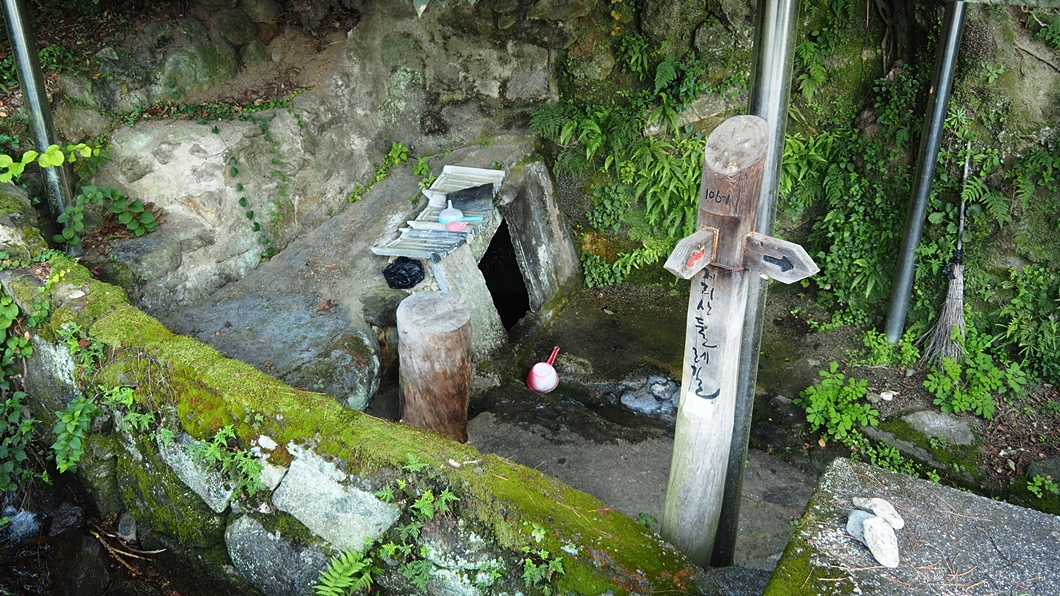 개울에 바가지 하나를 매달아 두었는데 그냥 떠 마셔도 된다는 뜻이겠지요.