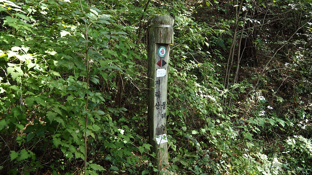 지리산 둘레길은 이런 표시판이 갈림길 곳곳에 세워져 있는데 한쪽 색깔만 보고 이동하면 됩니다.
