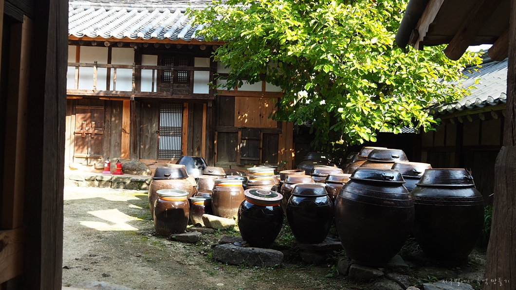 입구옆에 있는 커다란 나무통은 운조루의 자랑거리인 타인능해(他人能解)란 쌀독.