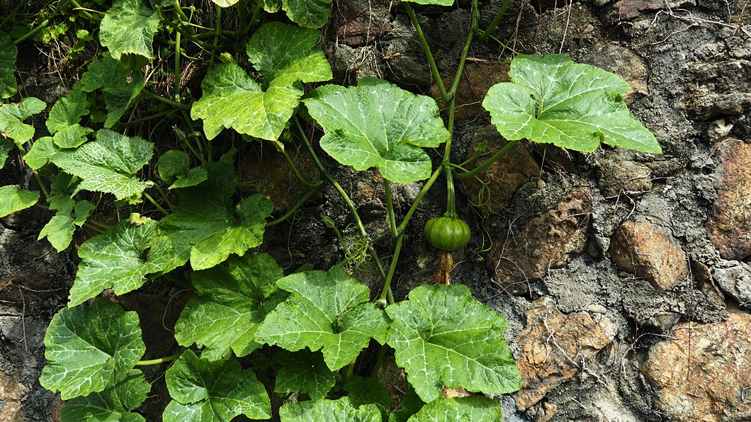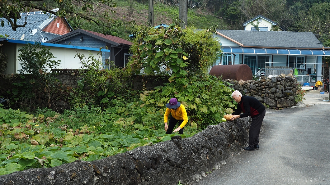 지 멀리 남의 집 밭에서 동네 할무니 기력이 약해 따지도 못하고 있는 호박을 따 주고 있습니다.