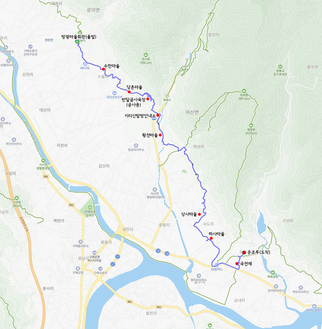 트레킹 코스 : 방광마을회관 - 수한마을 - 당촌마을 - 곰사육장(공사 중) - 황전마을 - 상사마을 - 하사마을 - 오미마을
