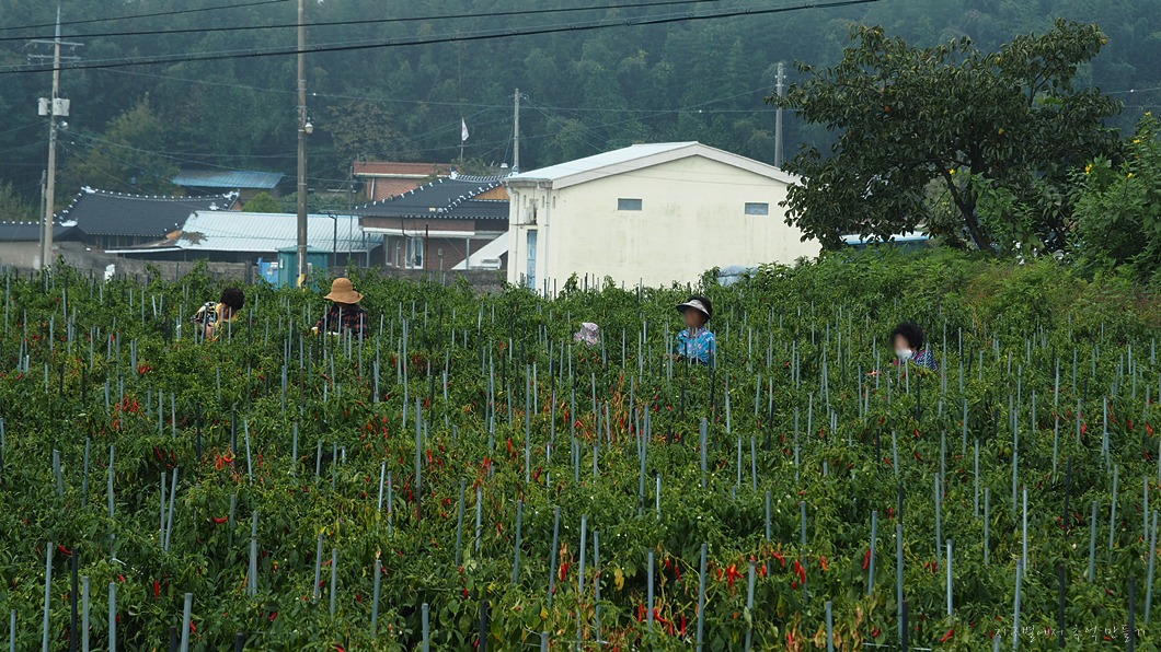 동네 아줌니들이 여러분 나와서 홍고추 마지막 수확을 하고 있습니다.