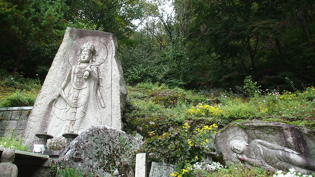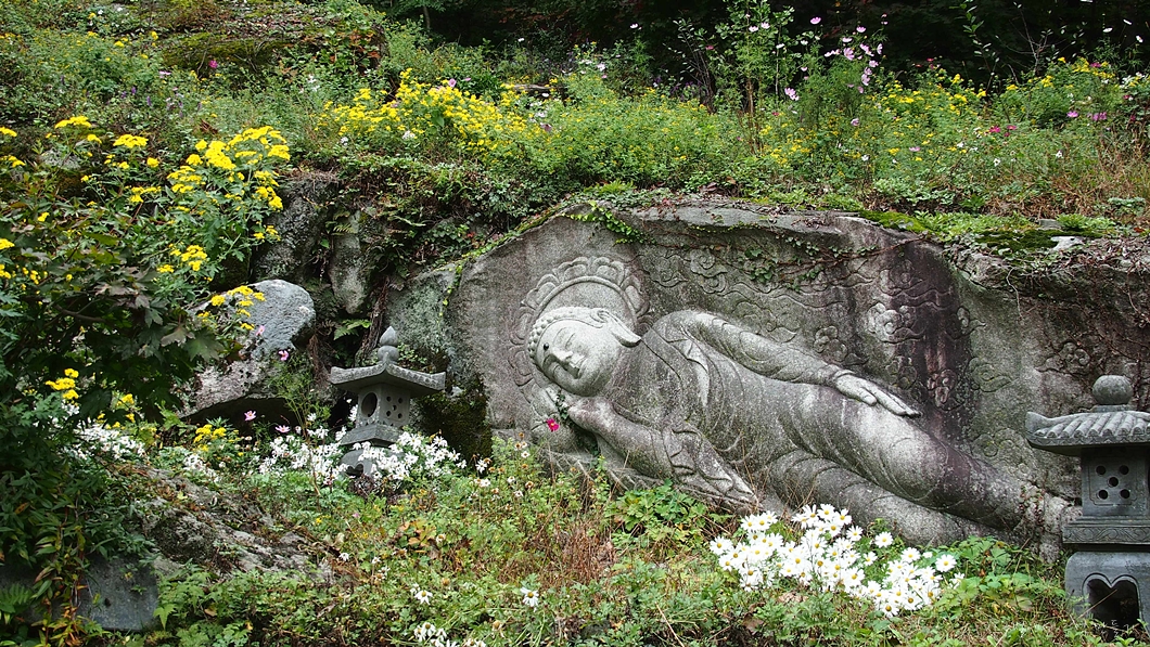 약사불은 중생 병구완 한다고 엄청 바빠 자리 앉을 시간조차 없는데 그 옆에는 와불이 꽃밭에서 쉬고 있네요.