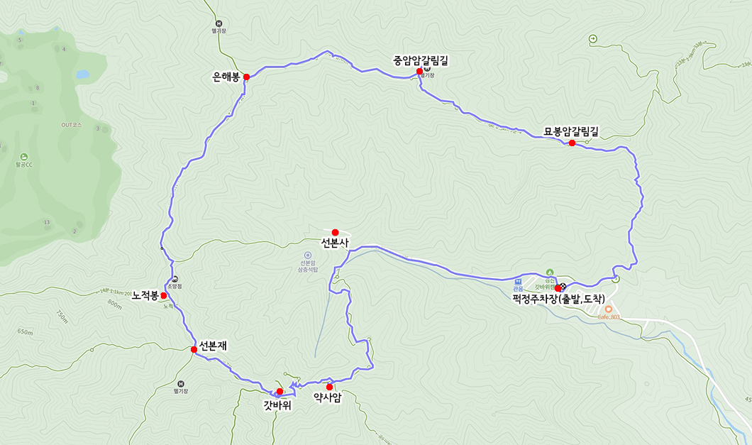 산행 코스 : 퍽정주차장 - 약사암 - 갓바위 - 노적봉 - 은해봉 - 시루봉 - 묘봉암갈림길 - 주차장(원점회귀)