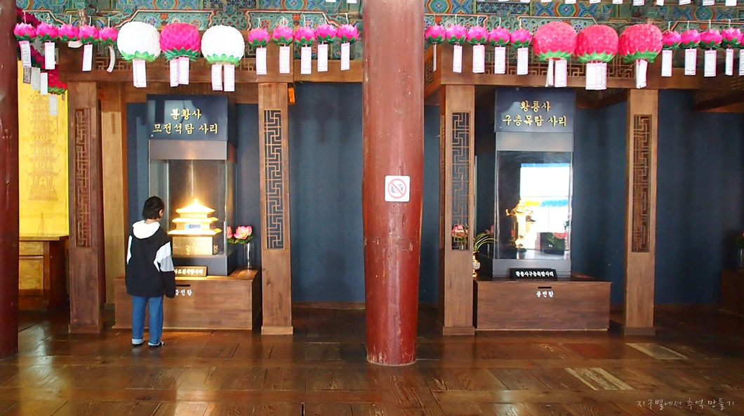 대웅전 뒤편에 있는 무설전에는 감은사, 황룡사, 분황사의 탑에서 나온 사리를 전시하고 있습니다.