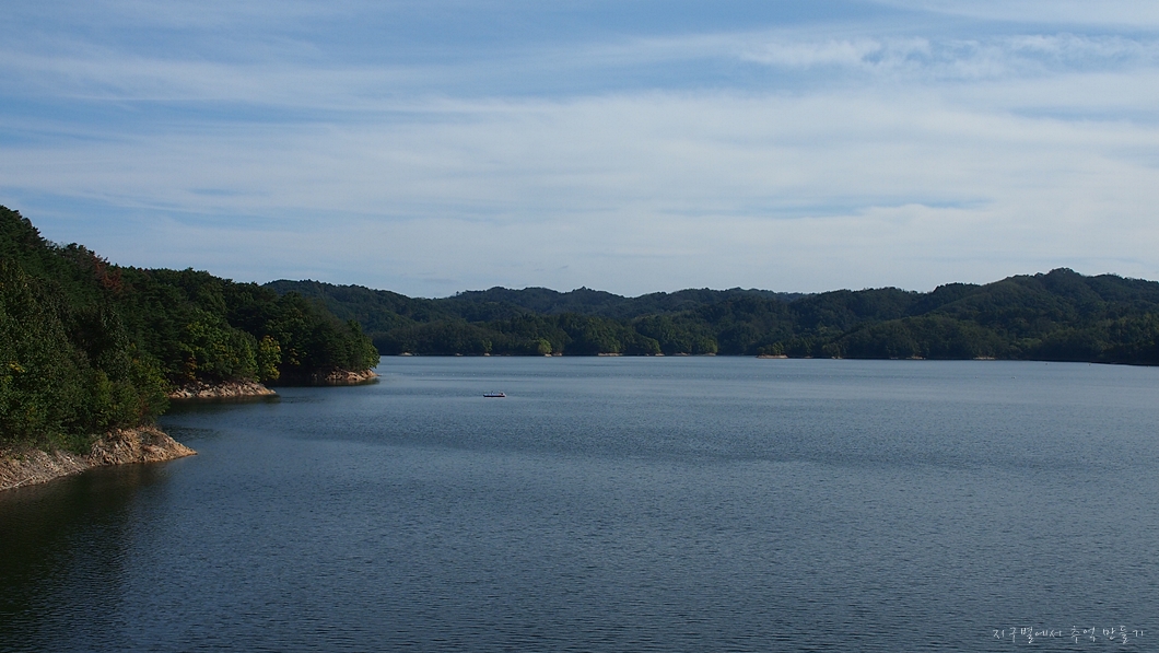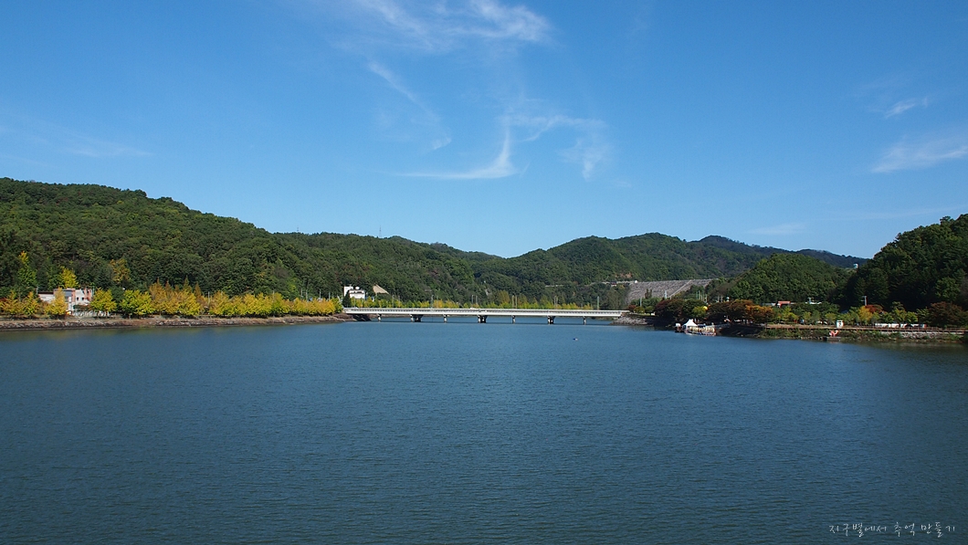 물을 막아둔 댐이 가운데는 흙이고 바깥으로는 돌을 쌓아서 댐을 만든 것이지요.