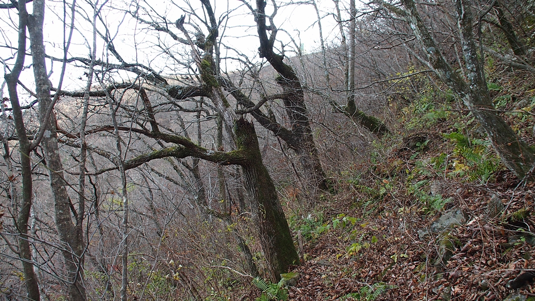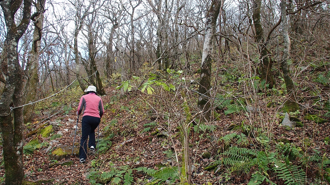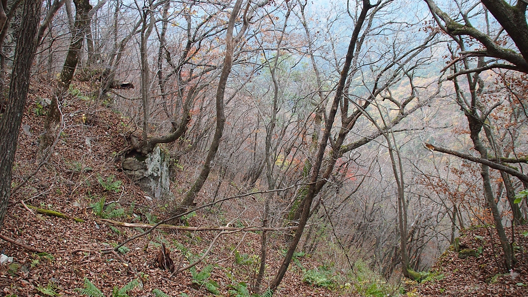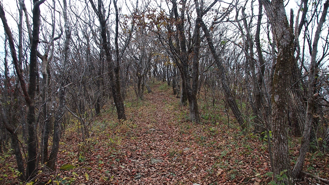 산 옆구리를 타고 가는 밋밋한 길이지만 돌길에 낙엽이 잔뜩 쌓여있어 조심해야 하는 구간.