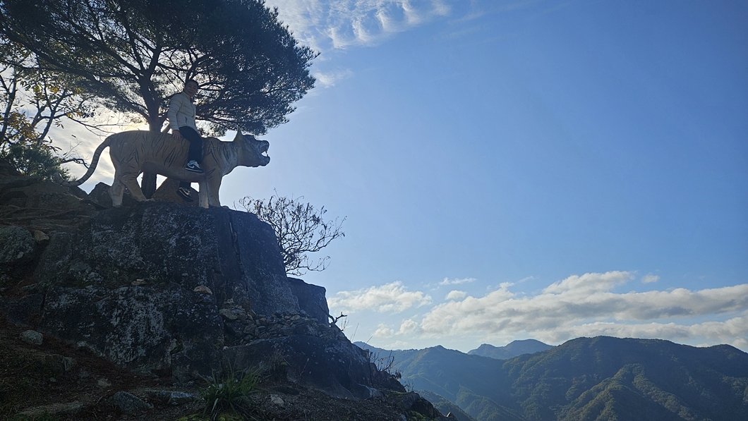 호랭이 옆이 천길만길 절벽이라 위험한데 김여사 호랭이 한번 타 보겠다고 하여..