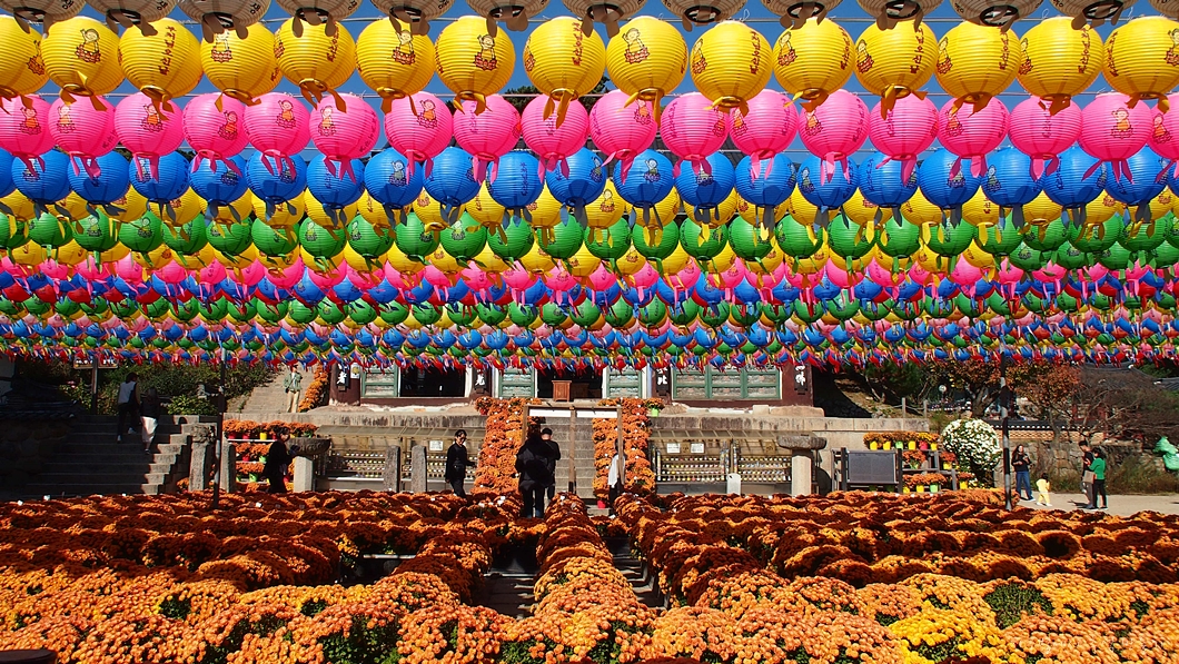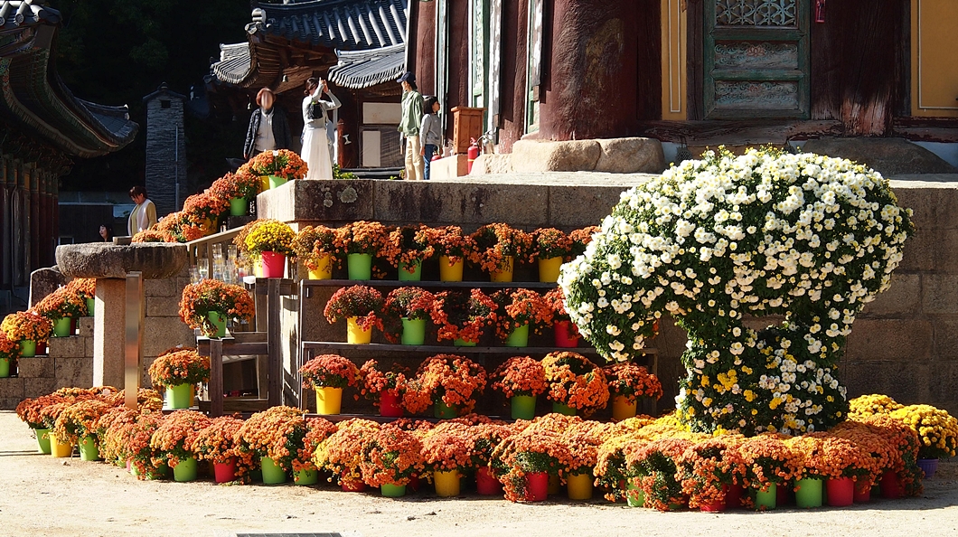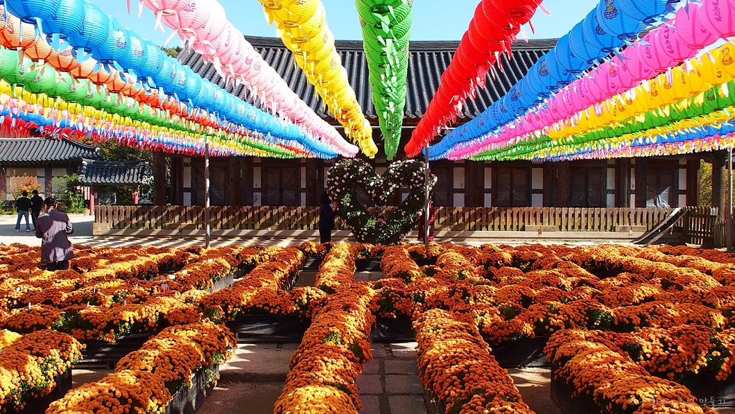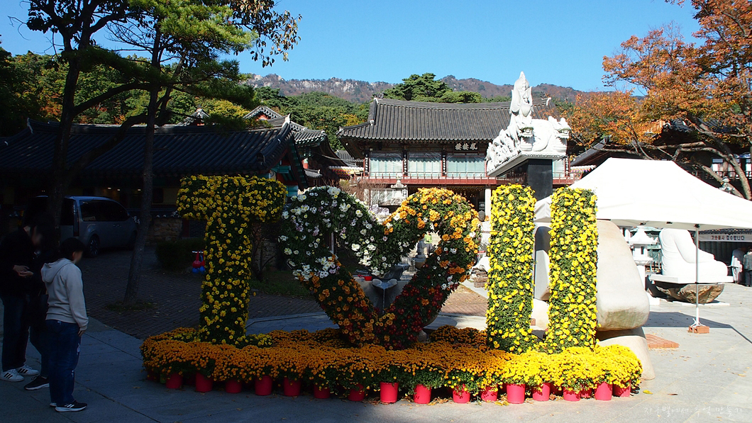 대웅전 앞 등 밑에 국화화분으로 만(卍) 자 돌림을 해 두었네요.