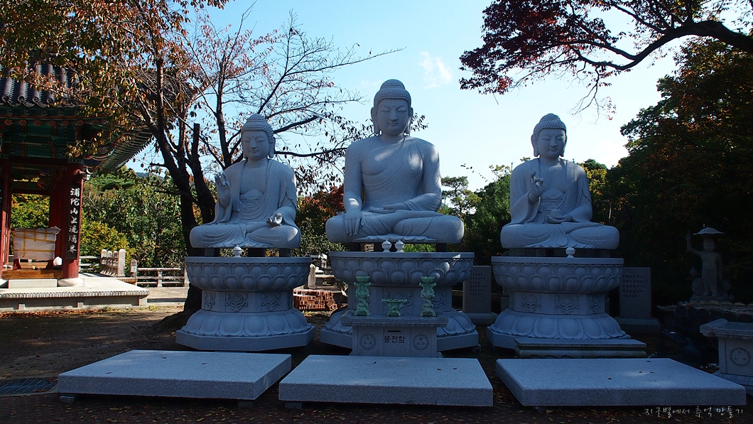 가운데 석가모니부처님이고 우측은 중생의 병구완을 하는 약사여래불, 좌측은 내세를 관장하는 아미타부처님,