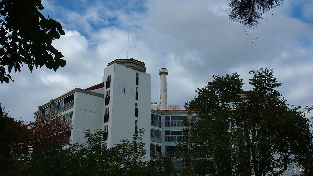 올라가는 길 옆으로 송정아파트가 보이는데 굴뚝도 보입니다.