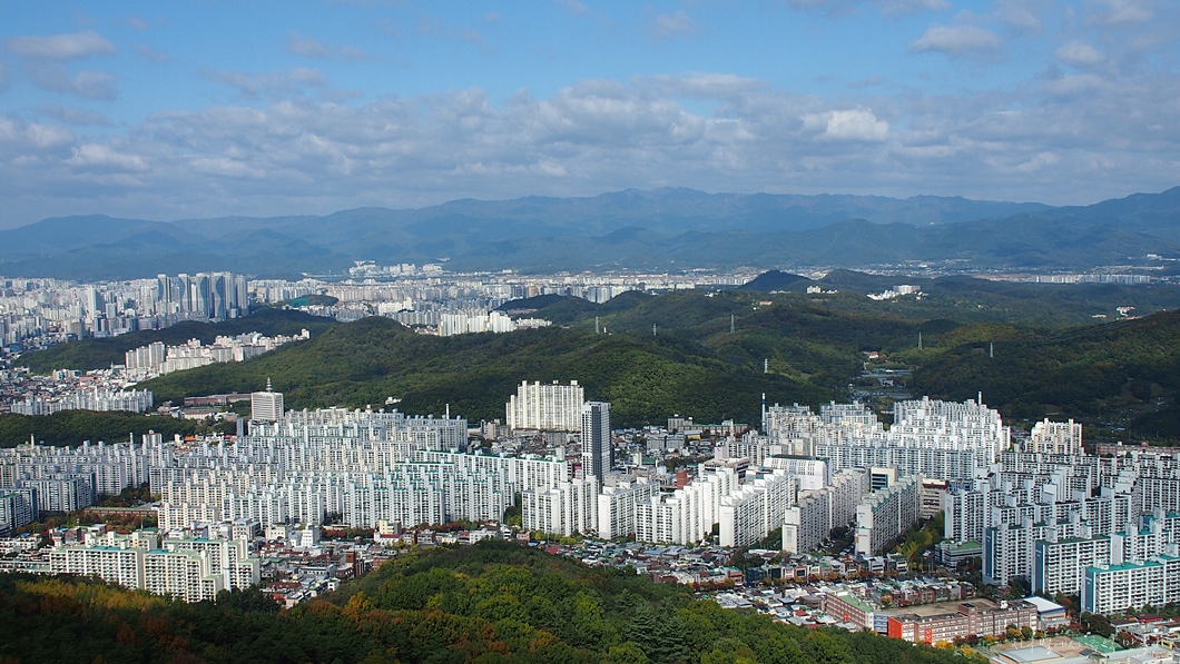 정자에서 내려가보는 대구 시가지 조망.