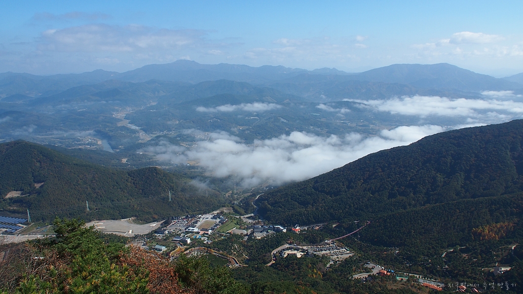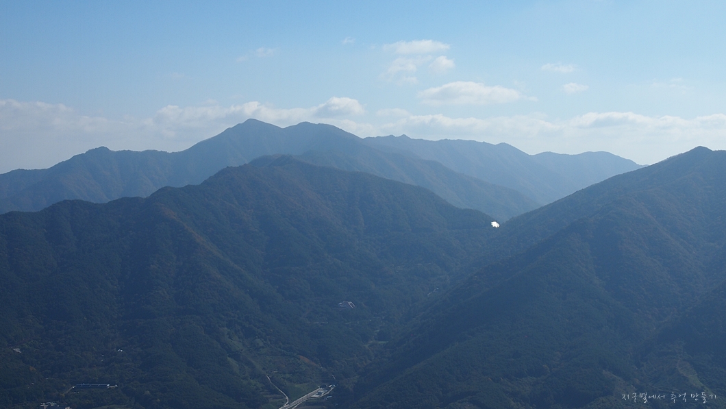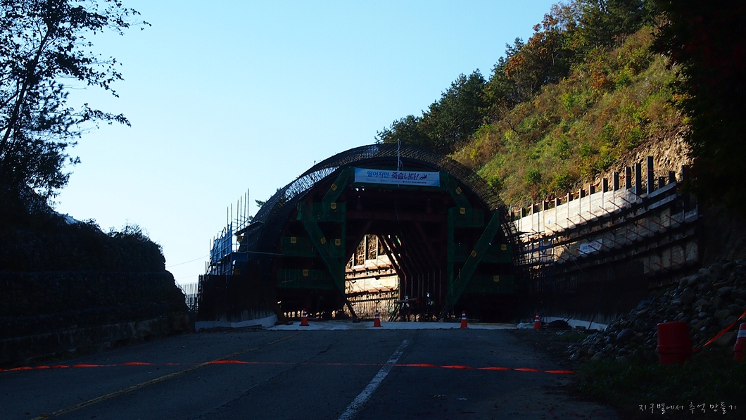우측 중간 고개에 하얗게 보이는 게 밤머리재 공사현장입니다.