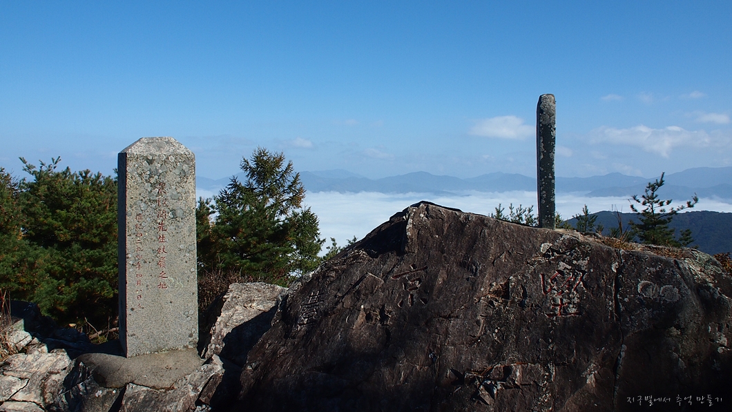 정상석 뒤로 보이는 높은 산이 지리산 천왕봉.