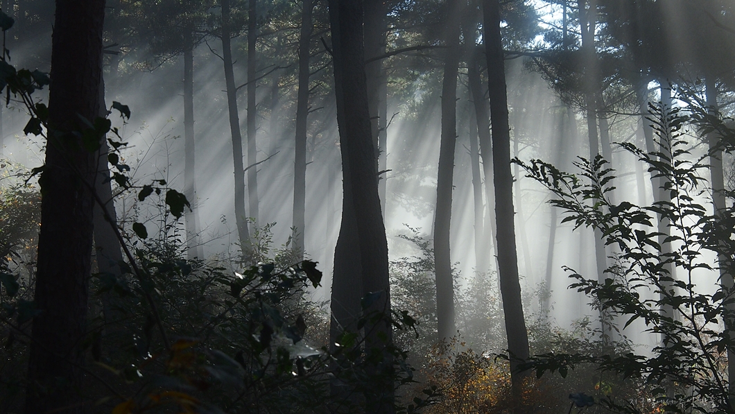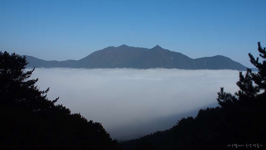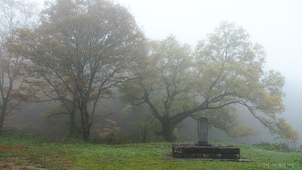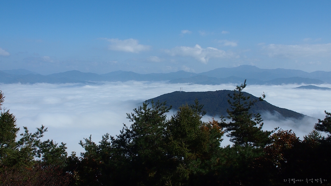 나무 사이로 저 멀리 왕산과 필봉산이 안개 위로 솟아 있네요.