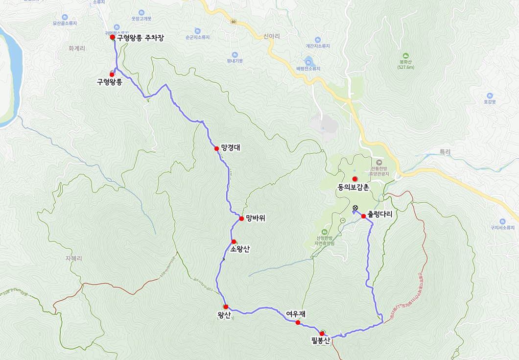 산행 코스 : 구형왕릉주차장 - 구형왕릉 - 망경대 - 왕산 - 여우재 - 필봉산 - 출렁다리 - 동의보감촌 - (택시 타고 차량 회수)