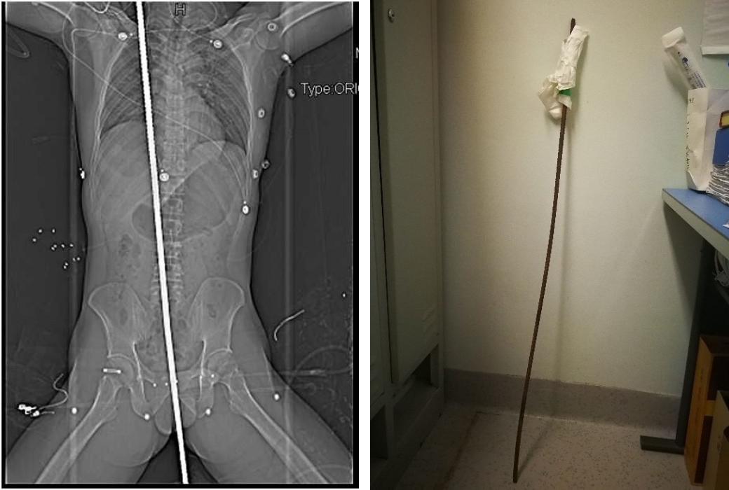 좌측 엑스레이 사진이 철근이 항문에서 어깨까지 관통하여 박혀진 사진이고 우측은 몸에서 빼낸 철근.