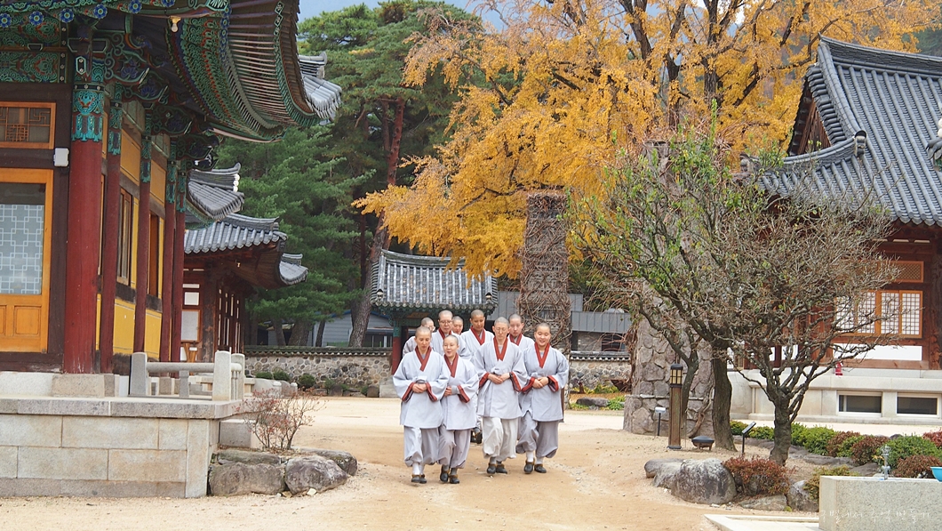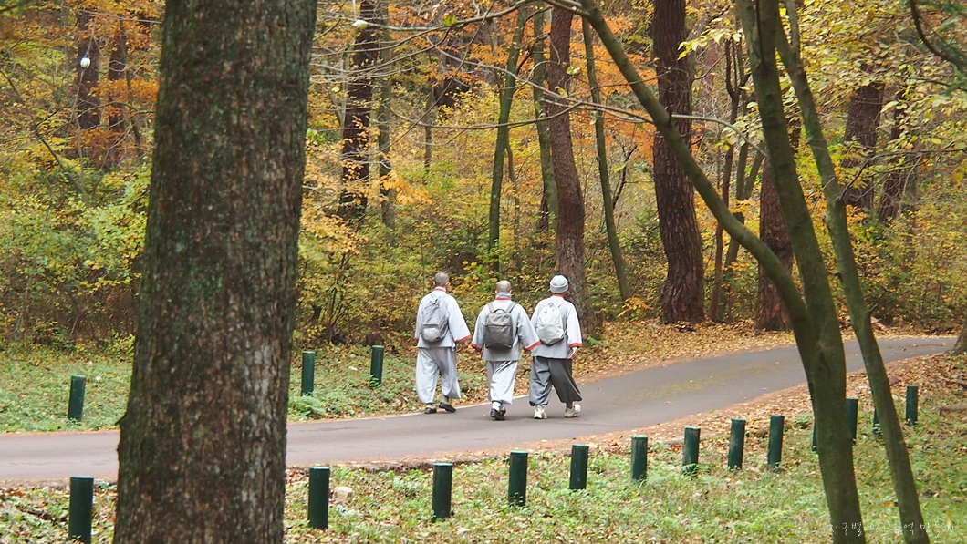 초보 입문 스님들이 걸어 나오는 뒤편의 은행나무는 한정판입니다.