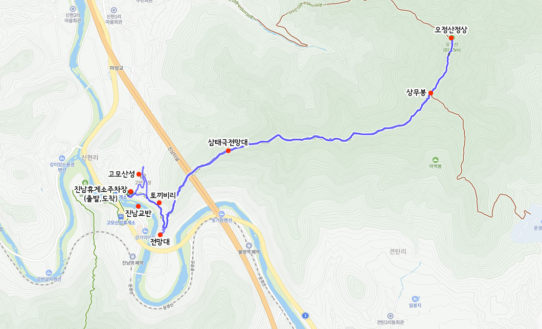 산행 코스 : 진남휴게소 주차장 - 토끼비리 - 태극정 - 상무봉 - 정상 - 되돌아내려와서 - 고모산성 - 주차장(원점회귀)