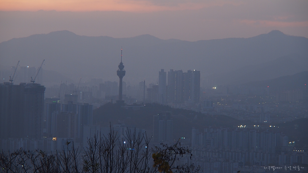 좌측 솟은 봉우리가 앞산 정상이고 대덕산으로 이어지는 완만한 능선이 보이네요.