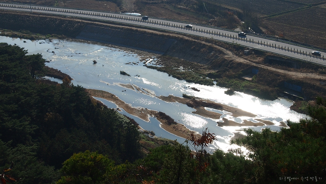 이렇게 개천 건너에서 봐야 제대로 구경이 가능하지유.