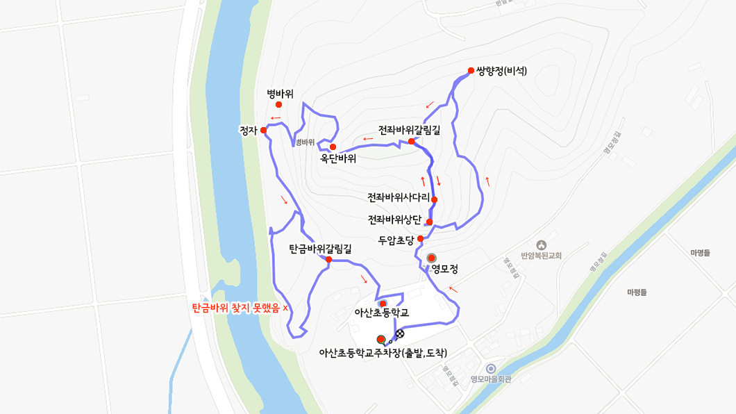 산행 코스 : 아산초교 주차장 - 두암초당 - 전좌바위 - 옥단바위 - 병바위 - 탄금바위(한 바퀴 돌아도 찾지 못했음) - 주차장(원점회귀)
