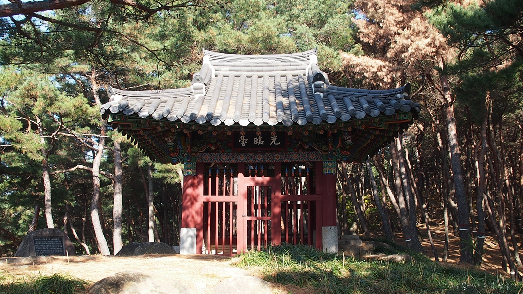 산 위에 유허비가 있는 전각과 광임대가 보이네요.