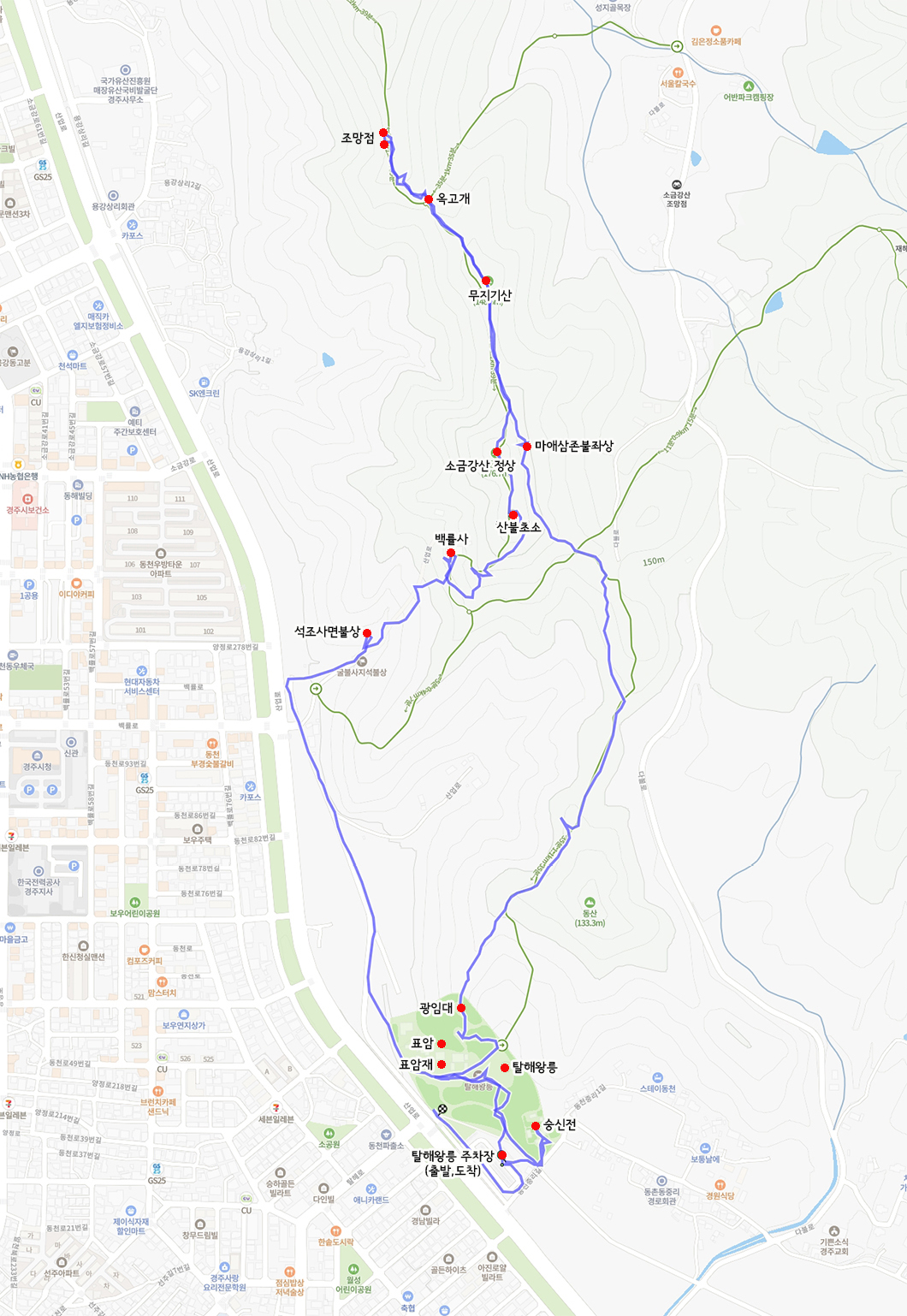 탈해왕릉 주차장 - 숭신전 - 표암재 - 탈해왕릉 - 광임대 - 마래삼존불좌상 - 옥고개 - 조망점 - (되돌아와서) - 소금강산 정상석 - 백률사 - 사면불상 - 주차장(원점회귀)