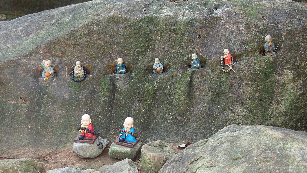 그 아래 바위를 나누려고 한 자국이 있는 곳에 누군가 동자승을 가득 채워놨네요.