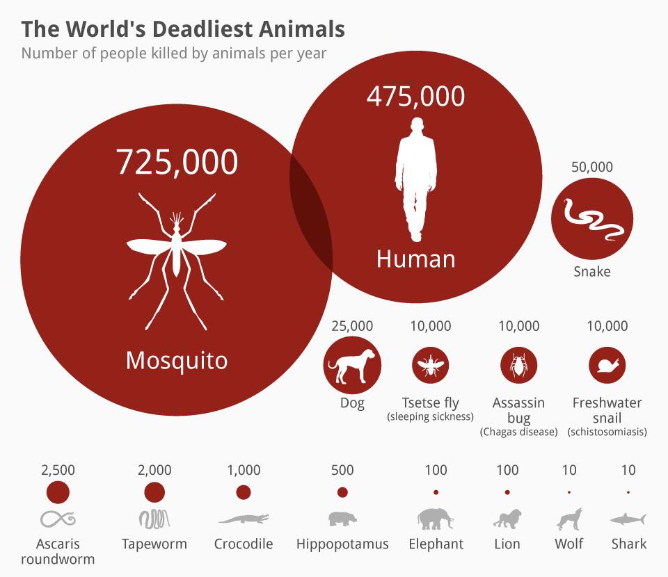 위 표는 1년 동안 인간을 가장 많이 죽게 한 동물들을 나타낸 것인데 이 통계는 집계한 곳마다 조금씩 다르게 표시를 하고 있는데 대개 1~3위까지는 동일합니다.