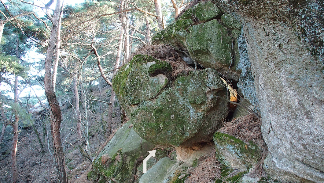 등산로는 그 바위 아래를 지나 바로 바위 뒤로(화살표) 올라가야 하구요.