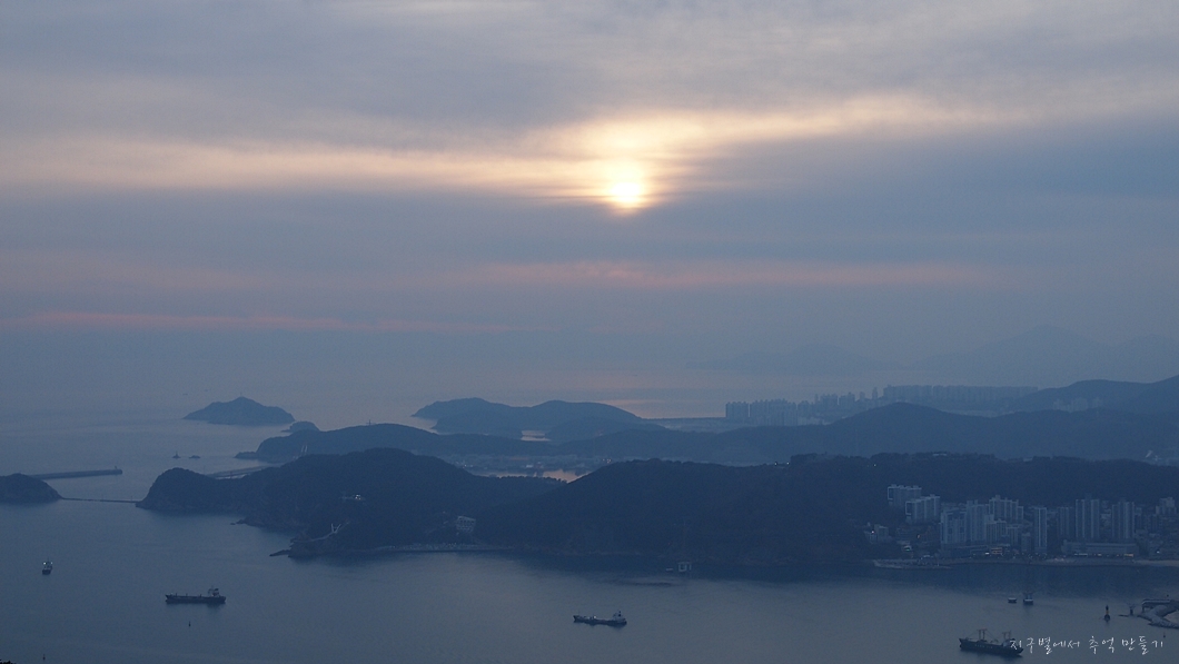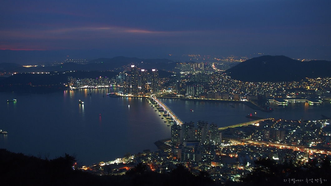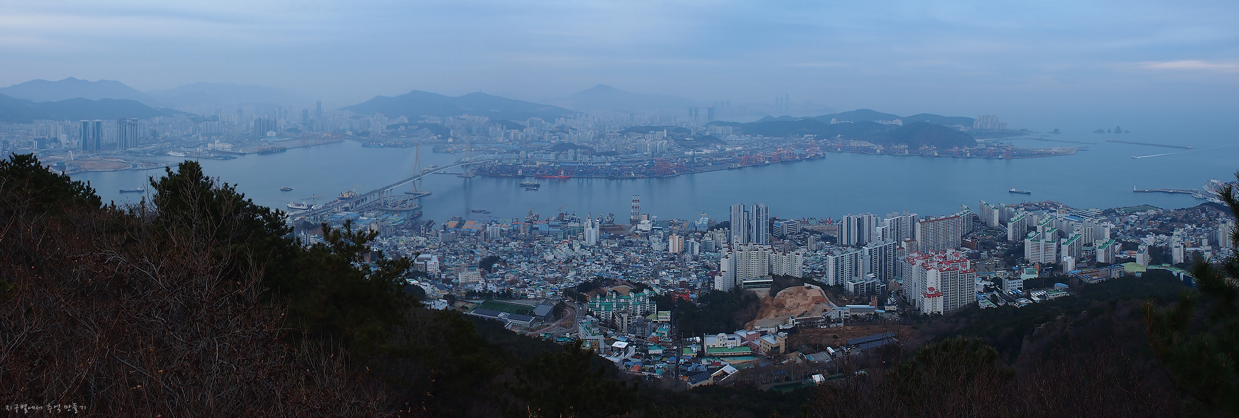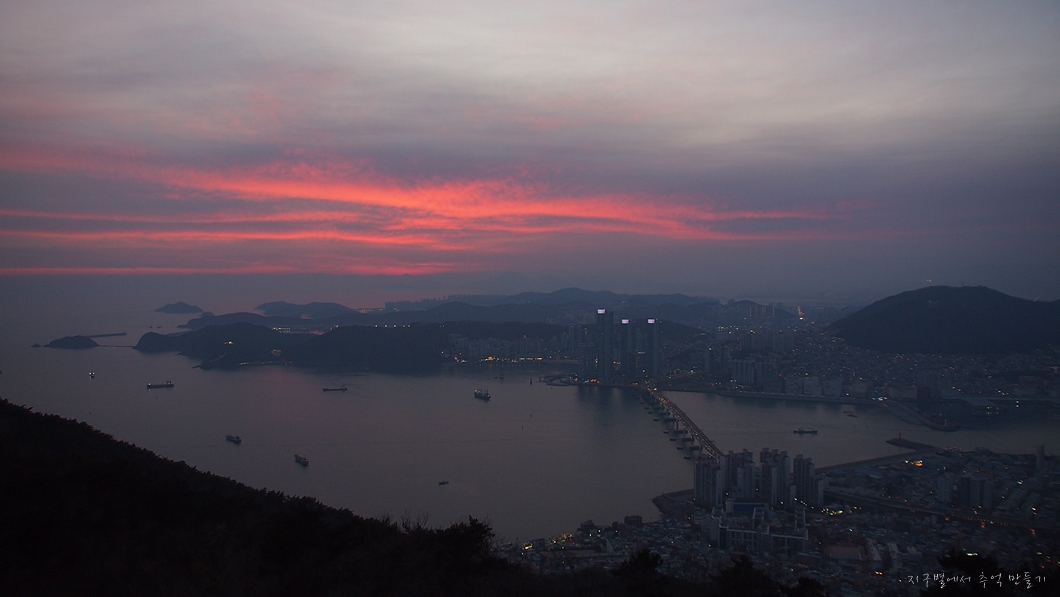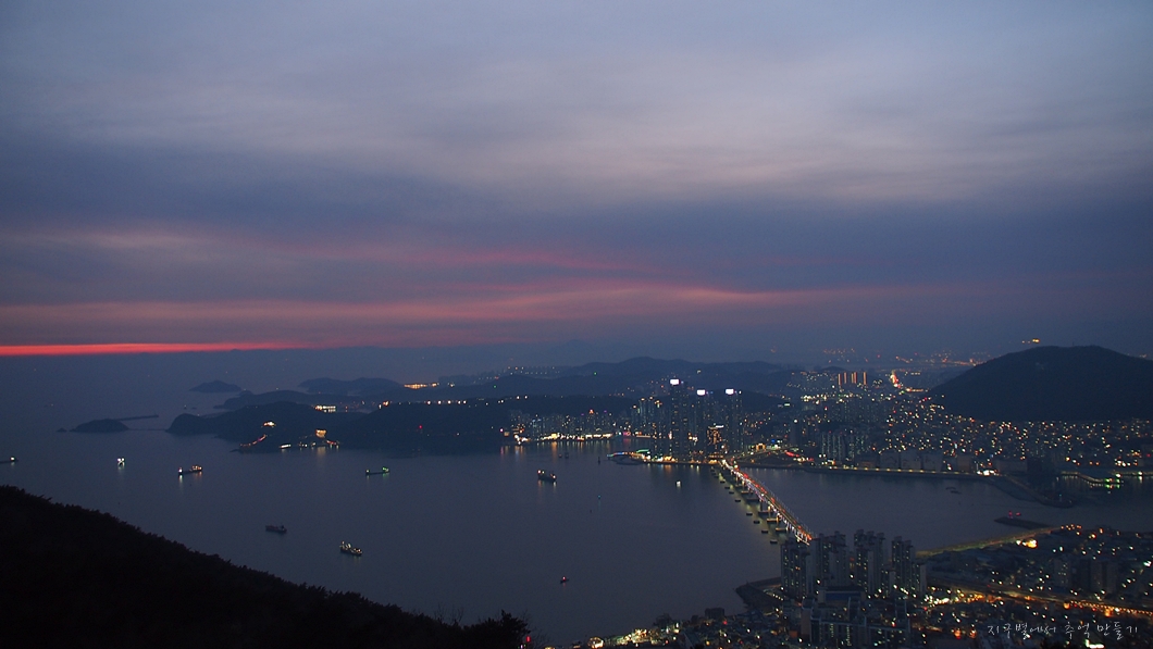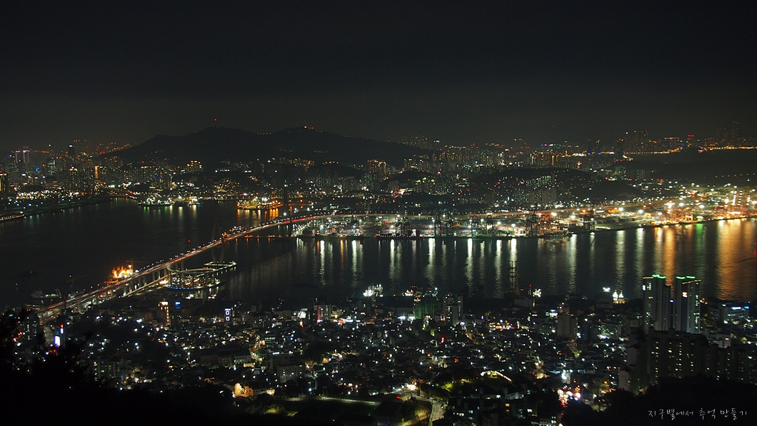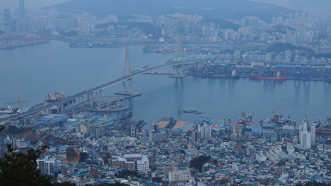 남항대교 건너 송도해수욕장이 희미하게 보이고 그 뒤로 멀리 가덕도까지는 뚜렷하게 보입니다.