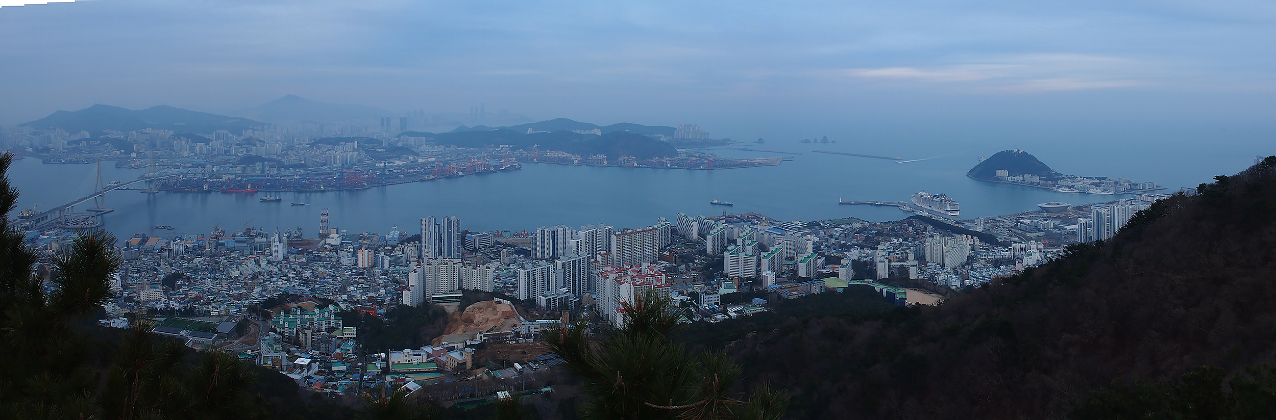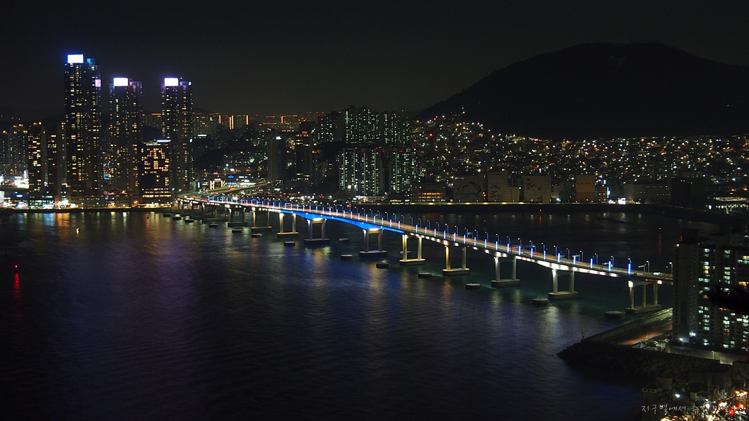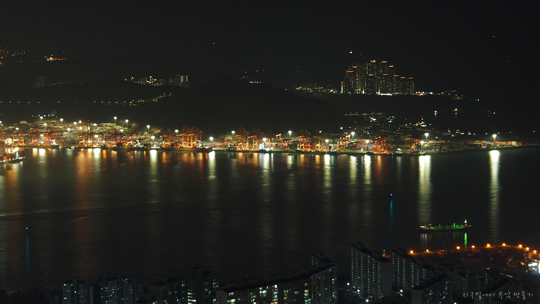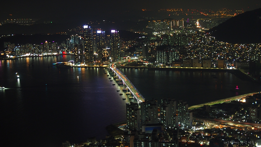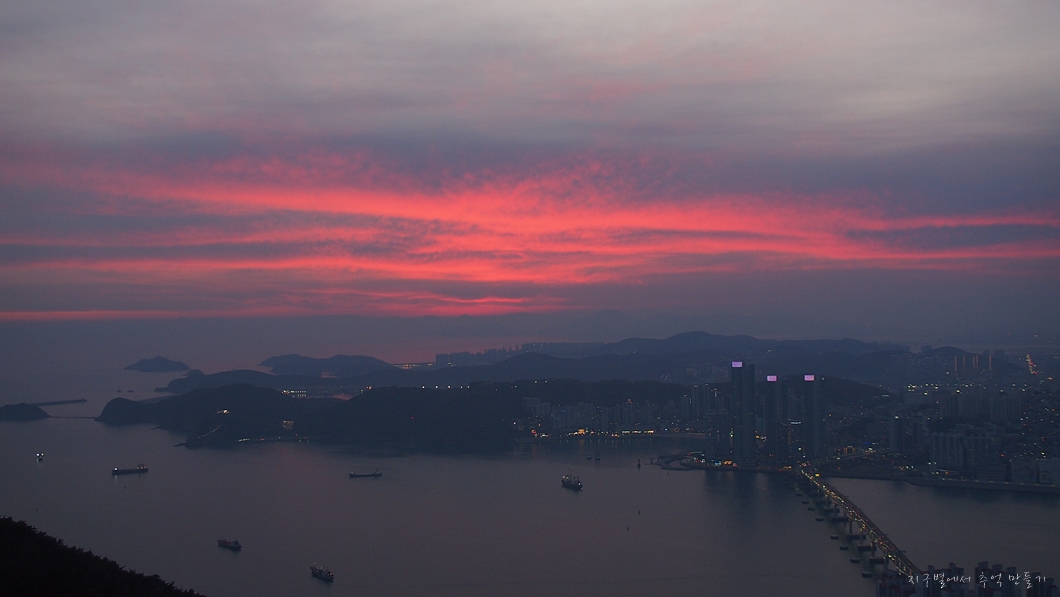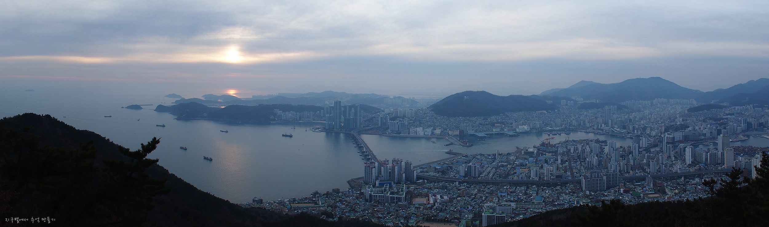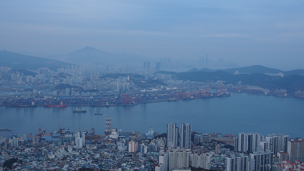 남항대교 건너 송도해수욕장이 희미하게 보이고 그 뒤로 멀리 가덕도까지는 뚜렷하게 보입니다.